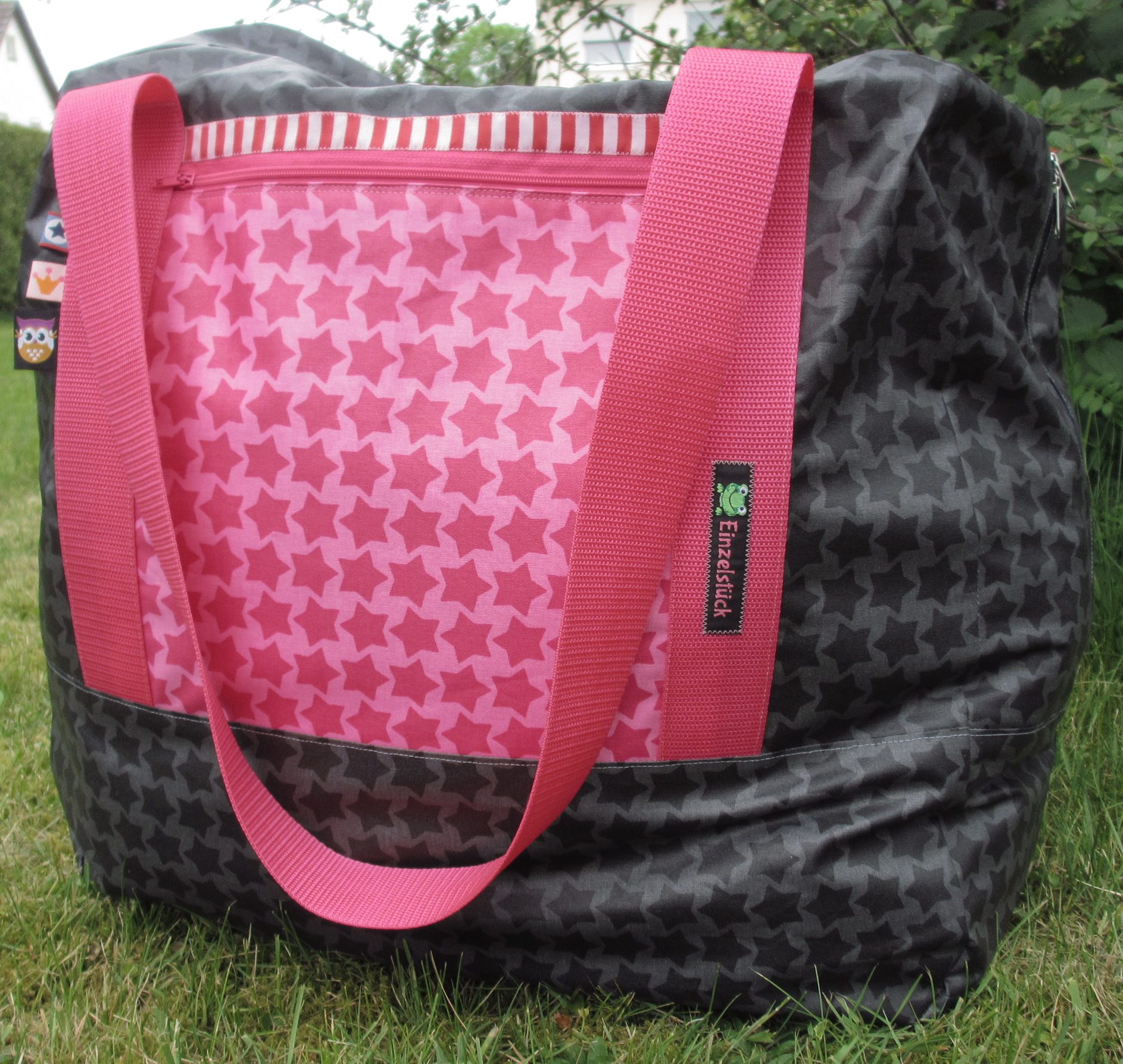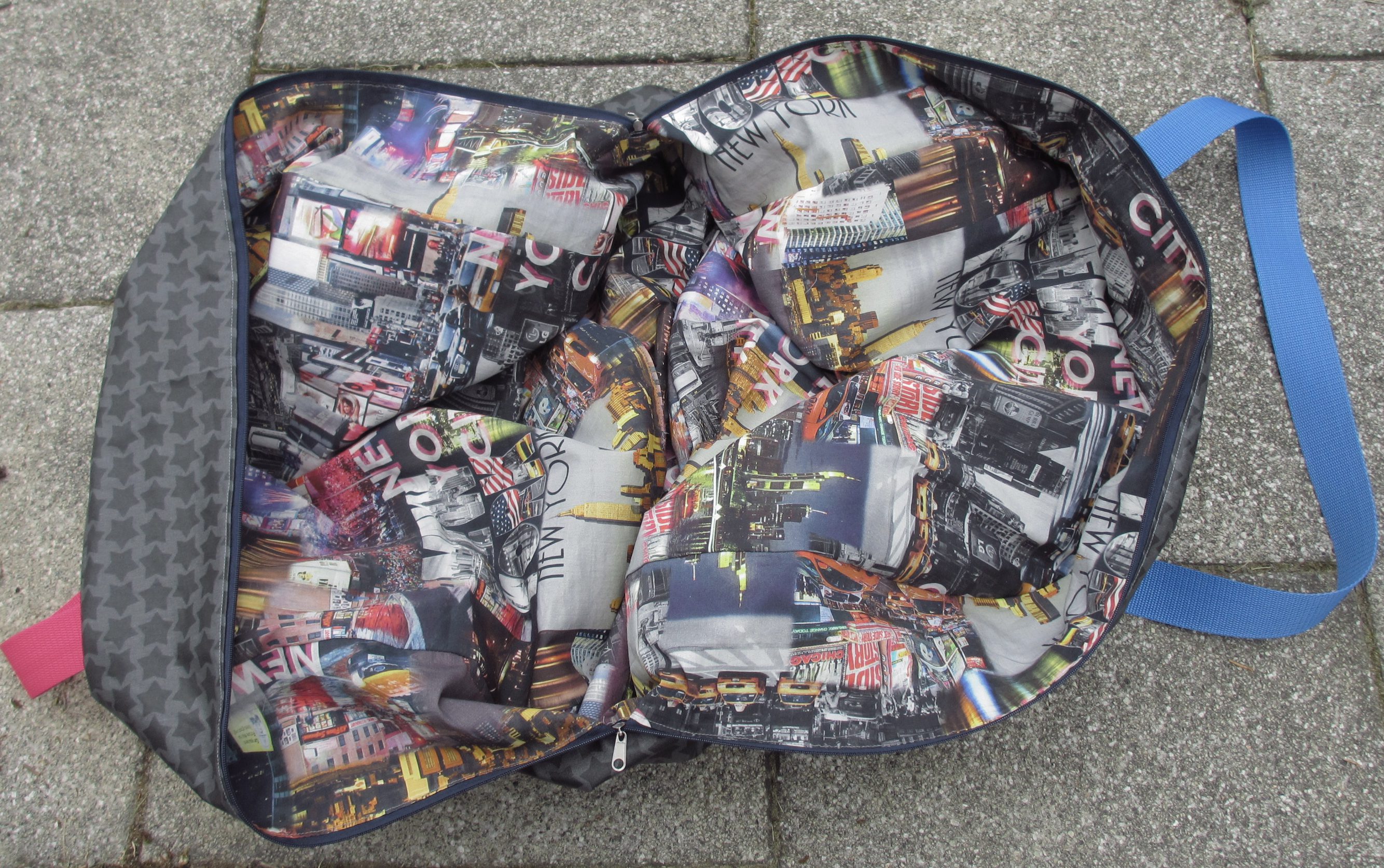 Wow. Kurz vor knapp kann ich auch die Reisetasche beenden und bin somit auf der Zielgeraden. Innen New York Dekostoff, außen – wie einfallslos, aber praktisch – staaars in drei Farben. Passend für eine Reisetasche, die ja auch gerne mal bei Regen verwendet wird.