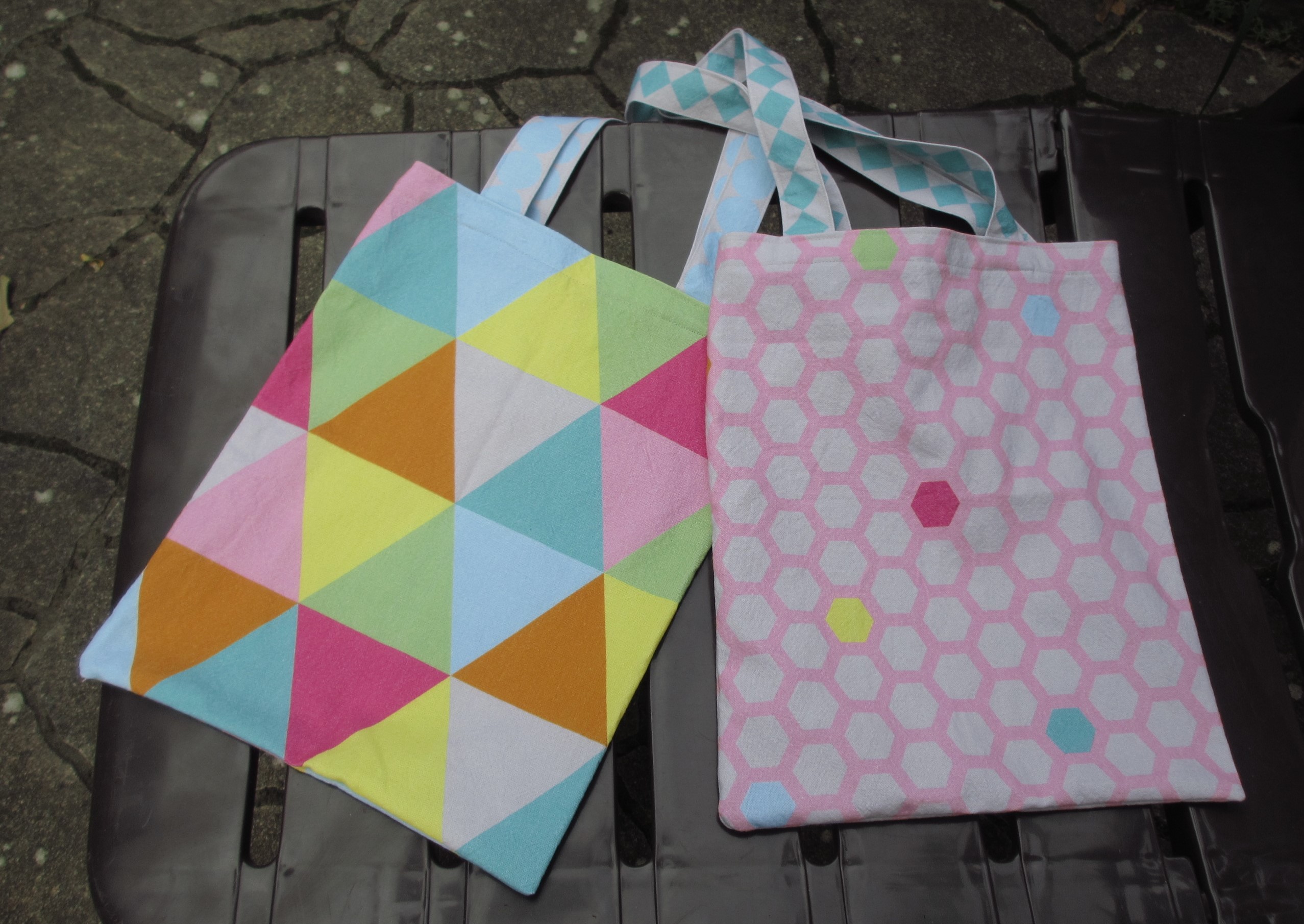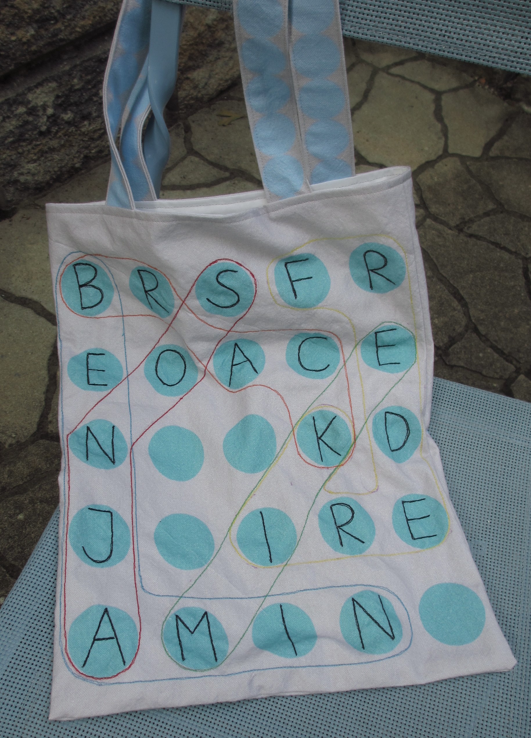So langsam lichten sich die Regale, hin und wieder taucht jedoch etwas auf, das dort schon jahrelang schlummert. In diesem Fall waren das zwei Taschenprojekte, die bestimmt schon seit 2016 auf eine Umsetzung warten. Da wären erstens die vier Taschen von farbenmix (Bags to love: Geometric). Einfach ausschneiden und loslegen. Man braucht nicht einmal ein Innenfutter. Bis man auf der Suche nach der Anleitung an verzierten Taschen hängen bleibt und plötzlich auch noch was ergänzen muss… Schließlich wurden zwei Taschen einfach so schnell zusammengenäht, die anderen beiden bekommen noch ein Extra. Eine davon ist auch schon fertig. Durch unsere Namen in dem Buchstabengitter ist sie eine Familieneinkaufstasche geworden.