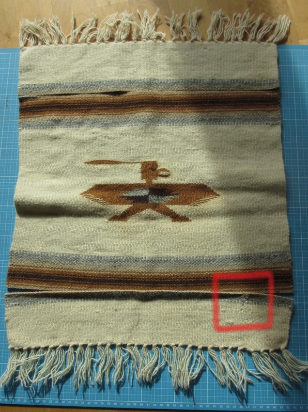 Auf der Suche nach neuen UFOs habe ich im August einen gewebten Wandbehang gefunden, der jahrelang im Elternhaus den Zugang zum Kamin verdeckte. Leider war da ein kleines Loch drin. Ob das durch falsche Lagerung, Katzen oder andere Tiere da hineingekommen ist, weiß ich leider nicht.