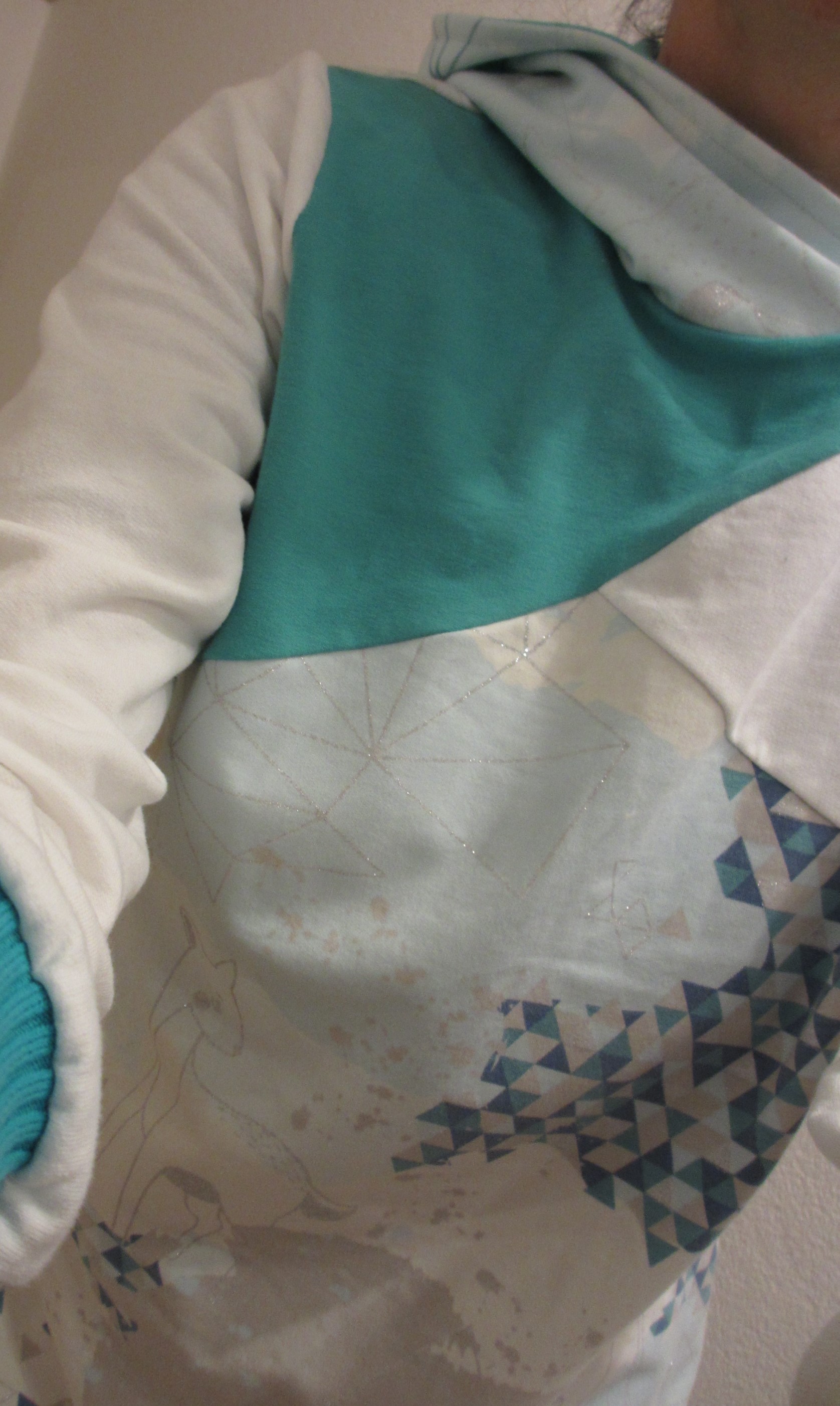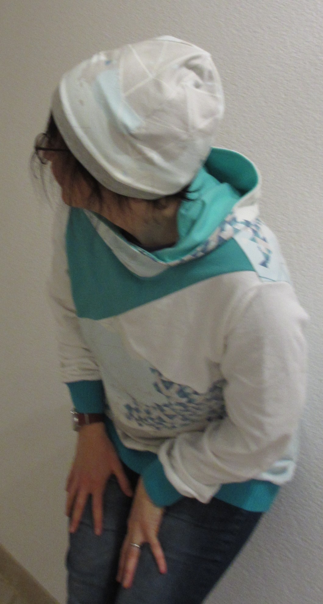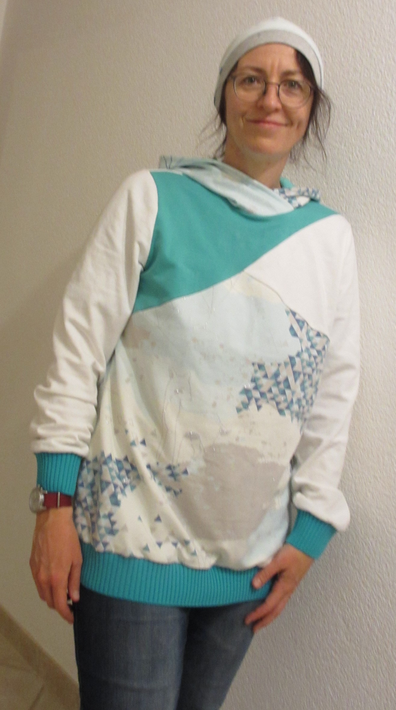 Für meinen bequemen Kapuzenhoodie in mint-weiß habe ich das Schnittmuster „Christina“ von Rockerbuben verwendet. Das hat sich bei den Kindern als Geburtstagsshirt ja schon oft bewährt 🙂 An den Armen und am Saum habe ich zum ersten Mal Strickbündchen angebracht. Das hat sehr gut funktioniert, nur beim Saum musste ich es wieder komplett abtrennen, weil es beim ersten Mal links auf rechts angenäht war…