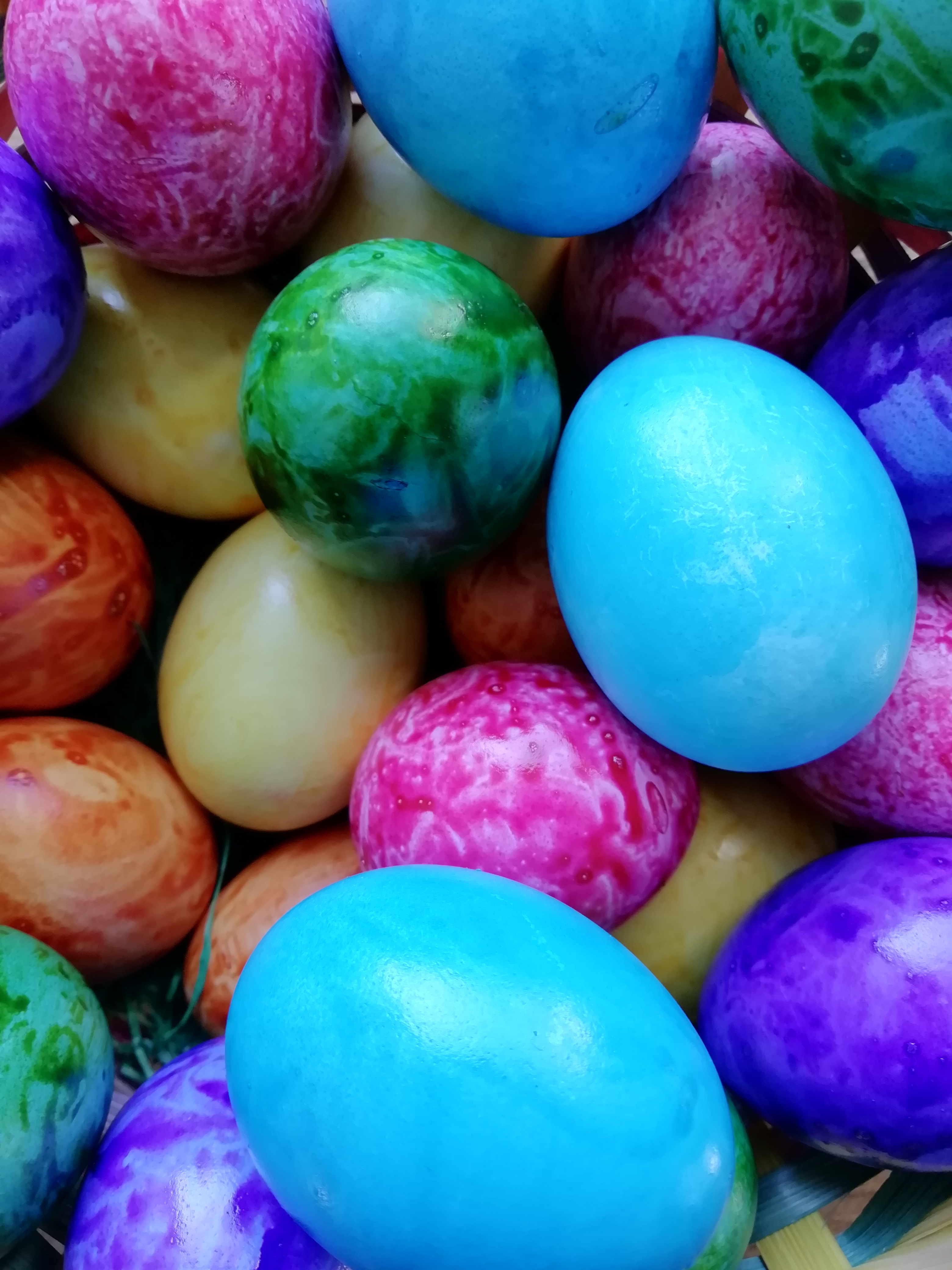 Wie man sieht, haben wir heuer wieder mit richtigen Eierfarben gefärbt. Weil natürlich auch Ostern ziemlich überraschend kam und ich es versäumt hatte, im letzten Monat rote Zwiebel zu kaufen und deren Schale zu sammeln. Außerdem hatten wir am Mittwoch Dampfnudeln mit Heidelbeerkompott zu Mittag, von der blauen Farbe war also auch nichts mehr übrig 🙂