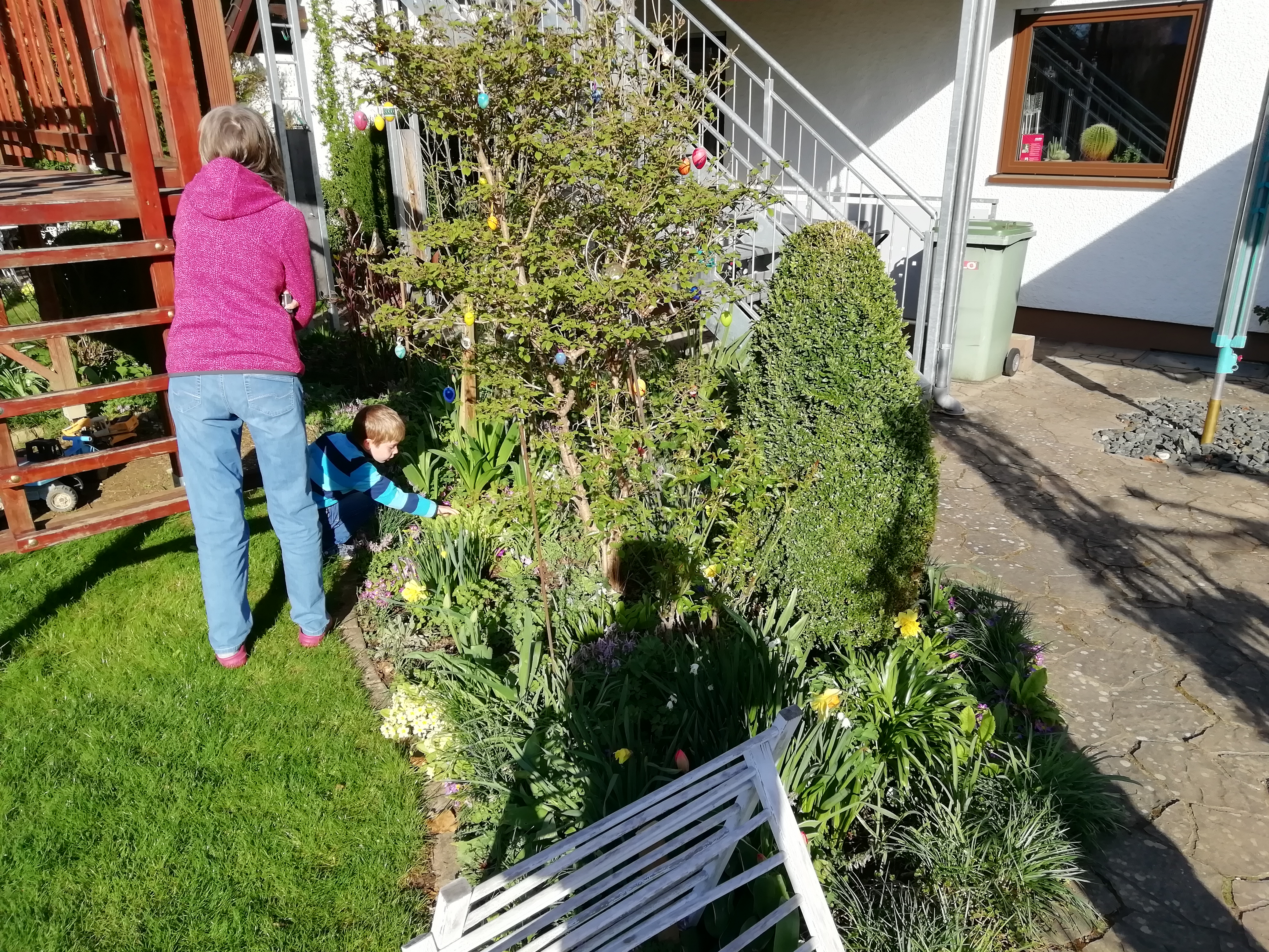 Kalt war es in diesem Jahr. Beinahe zu kalt zum Suchen, denn der Osterhase hat in beiden Gärten außerordentlich gute Verstecke befüllt… Ein kleines Schokoladenhuhn wird immer noch vermisst.