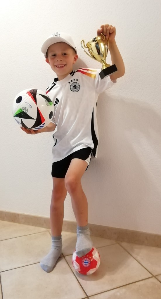 Ganz viel Fußballzeugs hat Benjamin bekommen. Jetzt sind die Jungs gut gerüstet für das nächste Spiel – und so wie es aussieht, findet hier am Freitag eine kleine Geburtstags-Fußballguck-Party statt. Mit Pizza und Almdudler. Mit Sonne und mehr als 20°. Mit 6 Jungs und 2 Mädchen. Und die beiden spielen richtig gut Fußball.