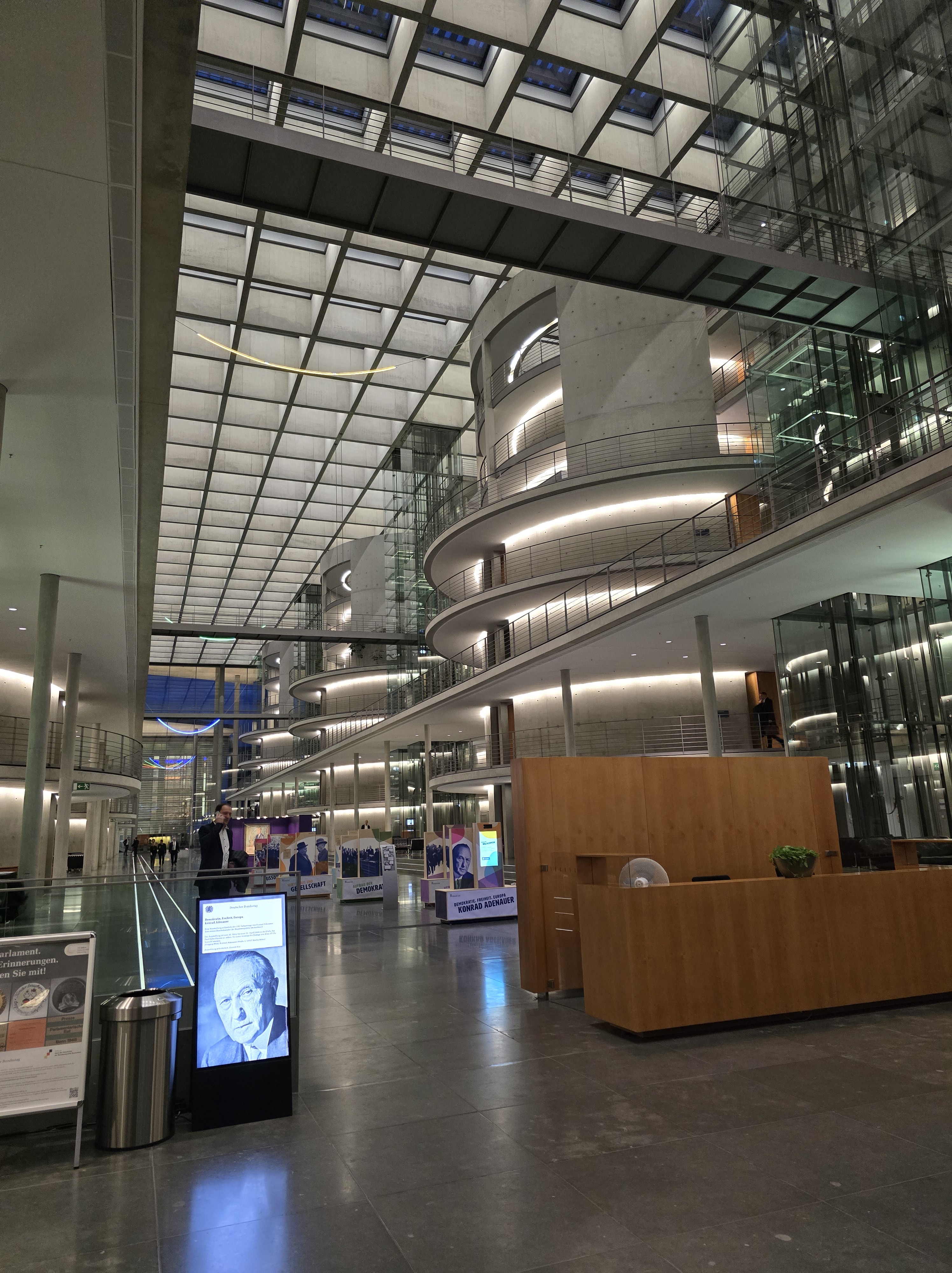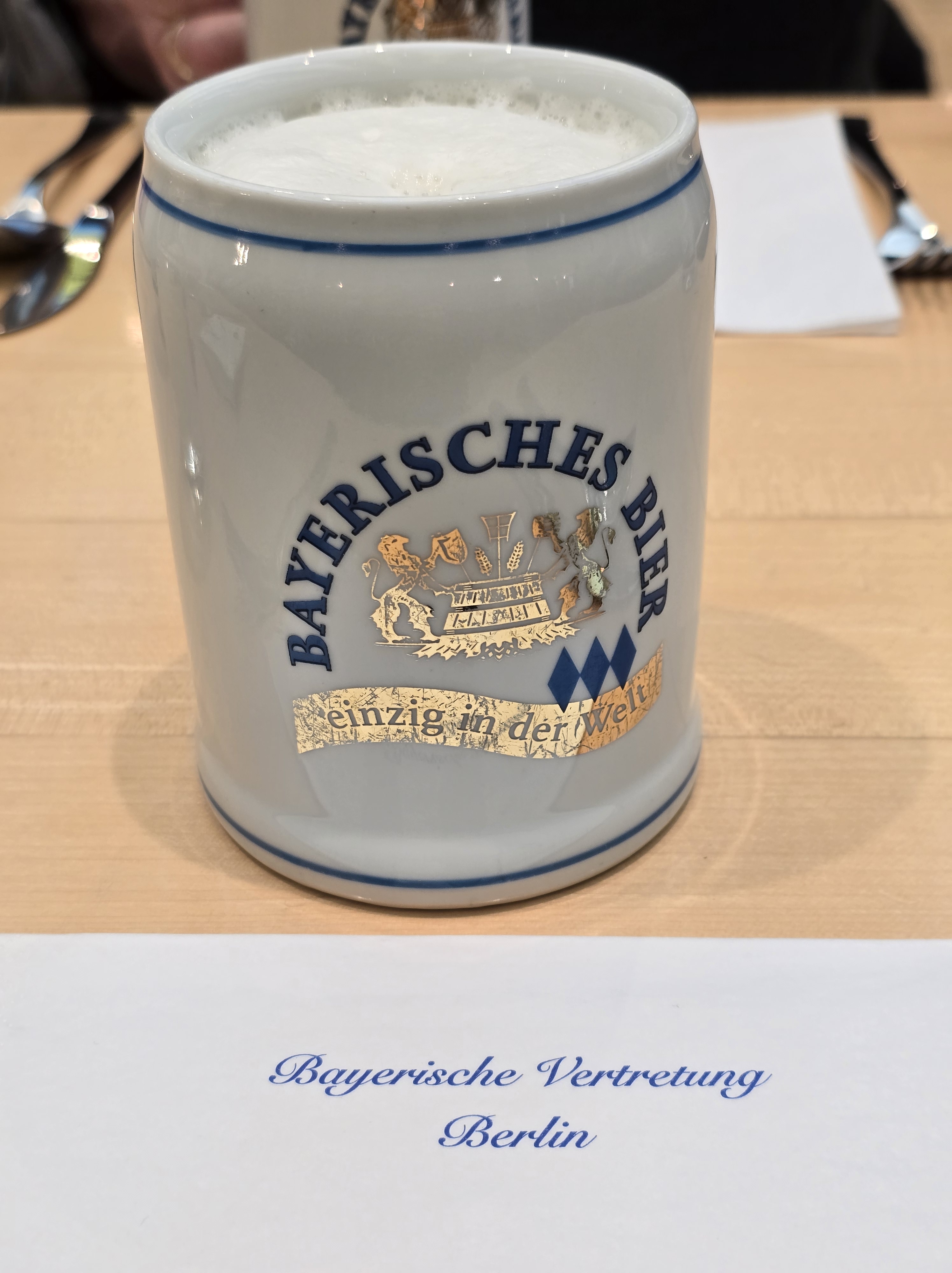 Am Mittwoch besuchten wir in der Früh die East Side Gallery, die nur ein paar Gehminuten vom Hotel entfernt war. Um halb 12 ging dann das Programm los, das uns zuerst zur Bayrischen Vertretung in Berlin brachte. Im Gebäude einer ehemaligen Bank wurden wir im Tresorraum mit einer halben Bier und Schweinebraten mit Knödel empfangen. Die Referentin erzählte uns von ihrer Arbeit. Sie ist eine „Schatzsucherin“ und versucht, in der Zeit in Berlin (von Montag Abend bis Freitag Vormittag) so viele Informationen wie möglich zu bekommen – im Aufzug, beim Frühstück, Mittagessen, Abendessen oder Zwischendrin – und diese so zu filtern, dass die Regierung in Bayern so schnell wie möglich über die dort relevanten Themen informiert wird.