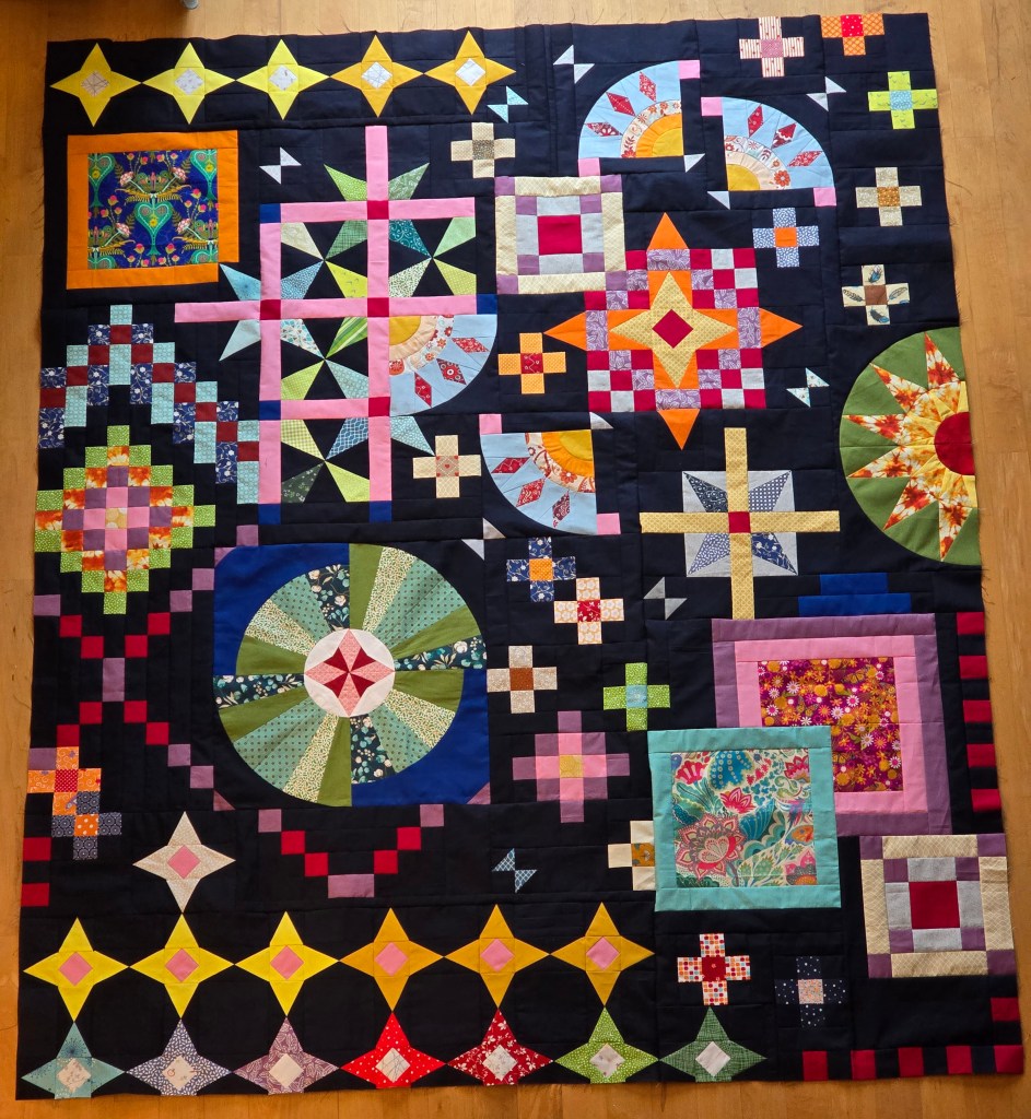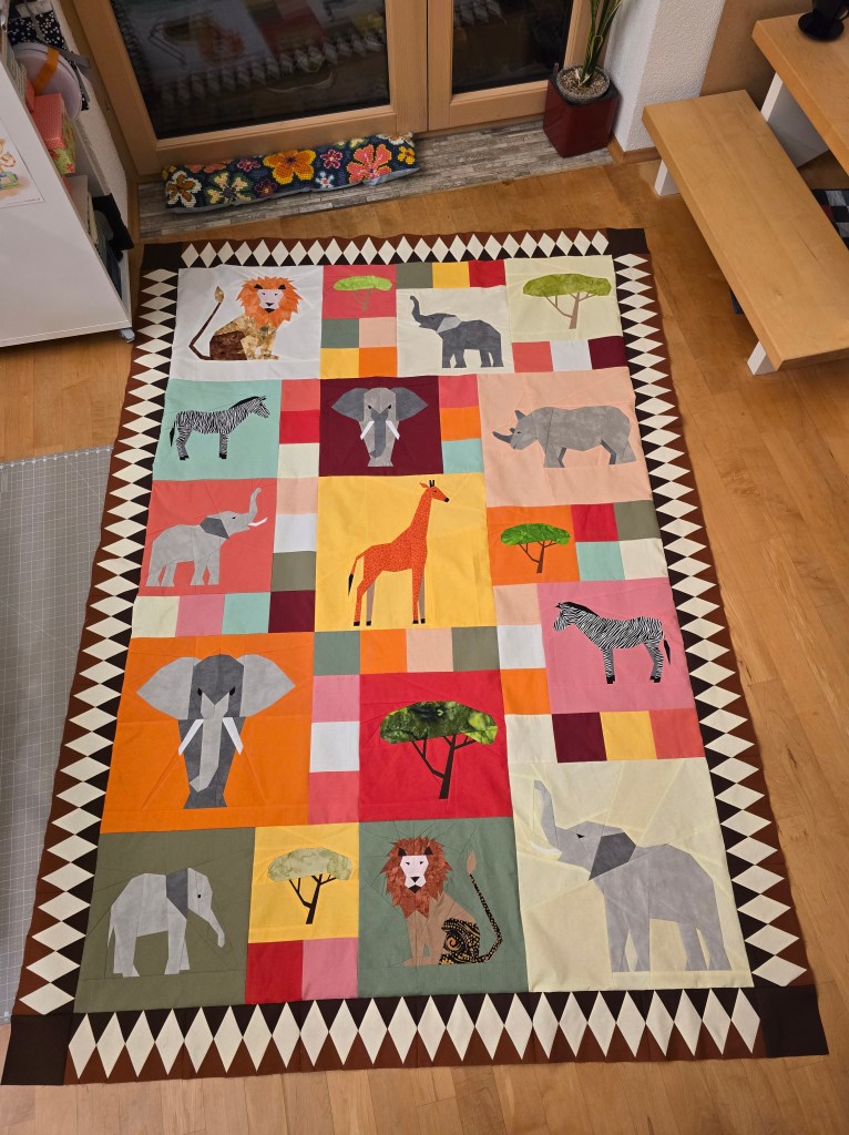 Noch in den Weihnachtsferien wurde das Top des „Quilt-Safari“ fertig gestellt. Hintergrundstoff, zusammengestückeltes Batting und ein fast aufgeräumtes Atelier verlangen geradezu nach einer Quiltsession nach den Osterfeiertagen. Im Februar ist das Top des Positivities von 2024 fertig geworden – jetzt fehlt noch eine Rückseite, damit ich Rachel wieder mit dem Quilten beauftragen kann.