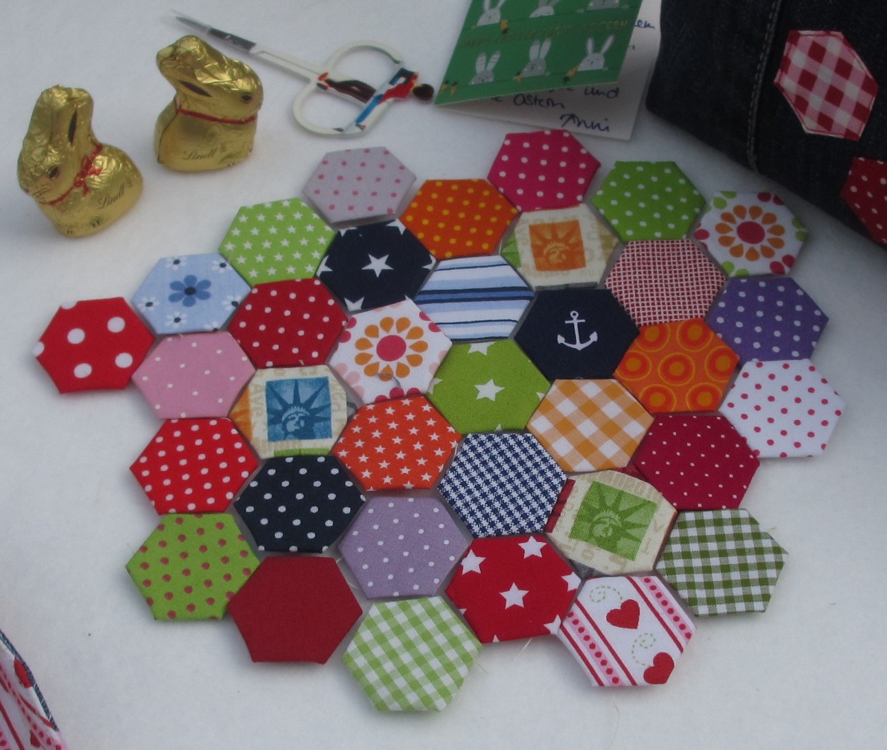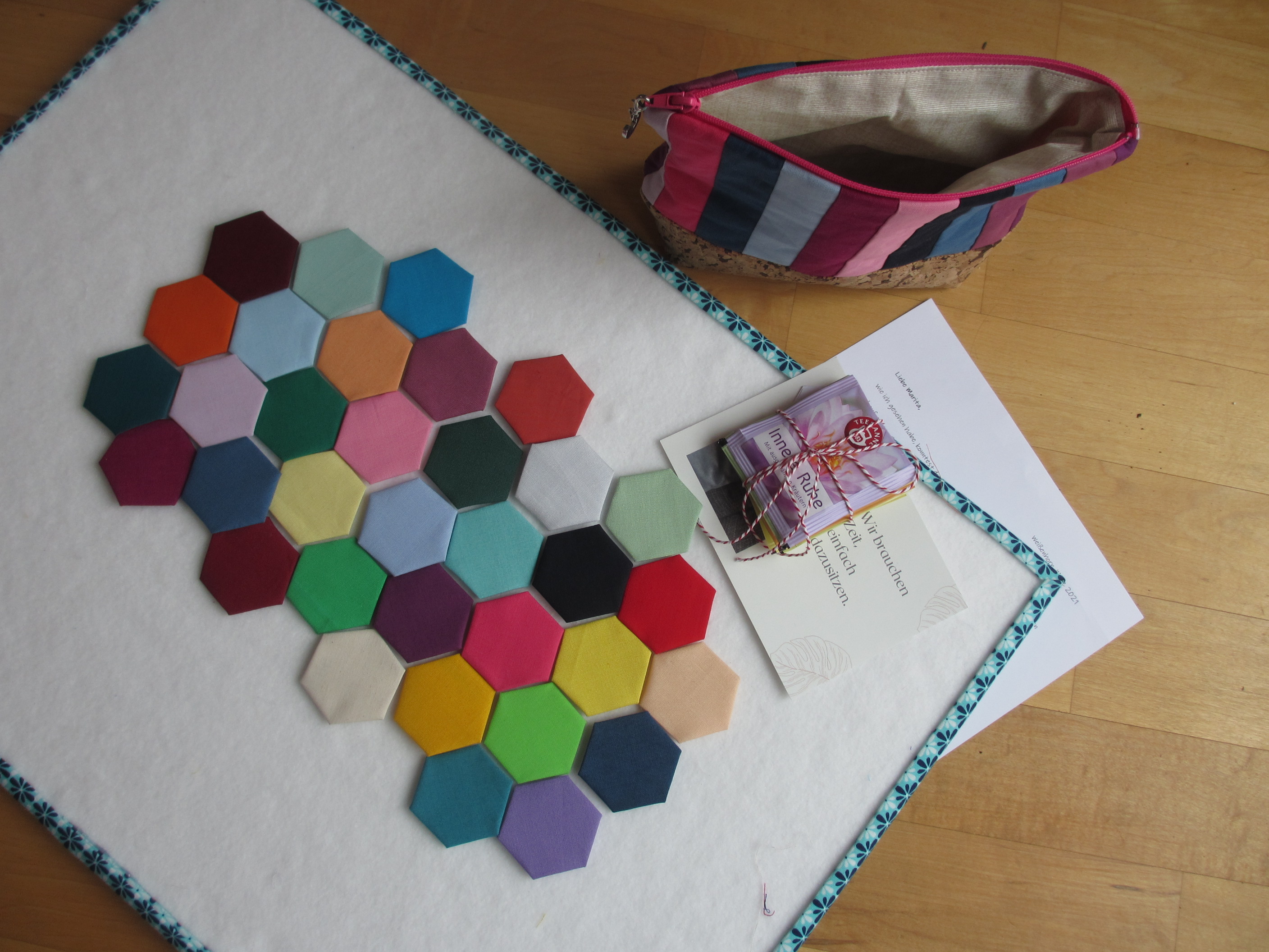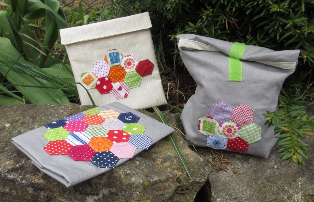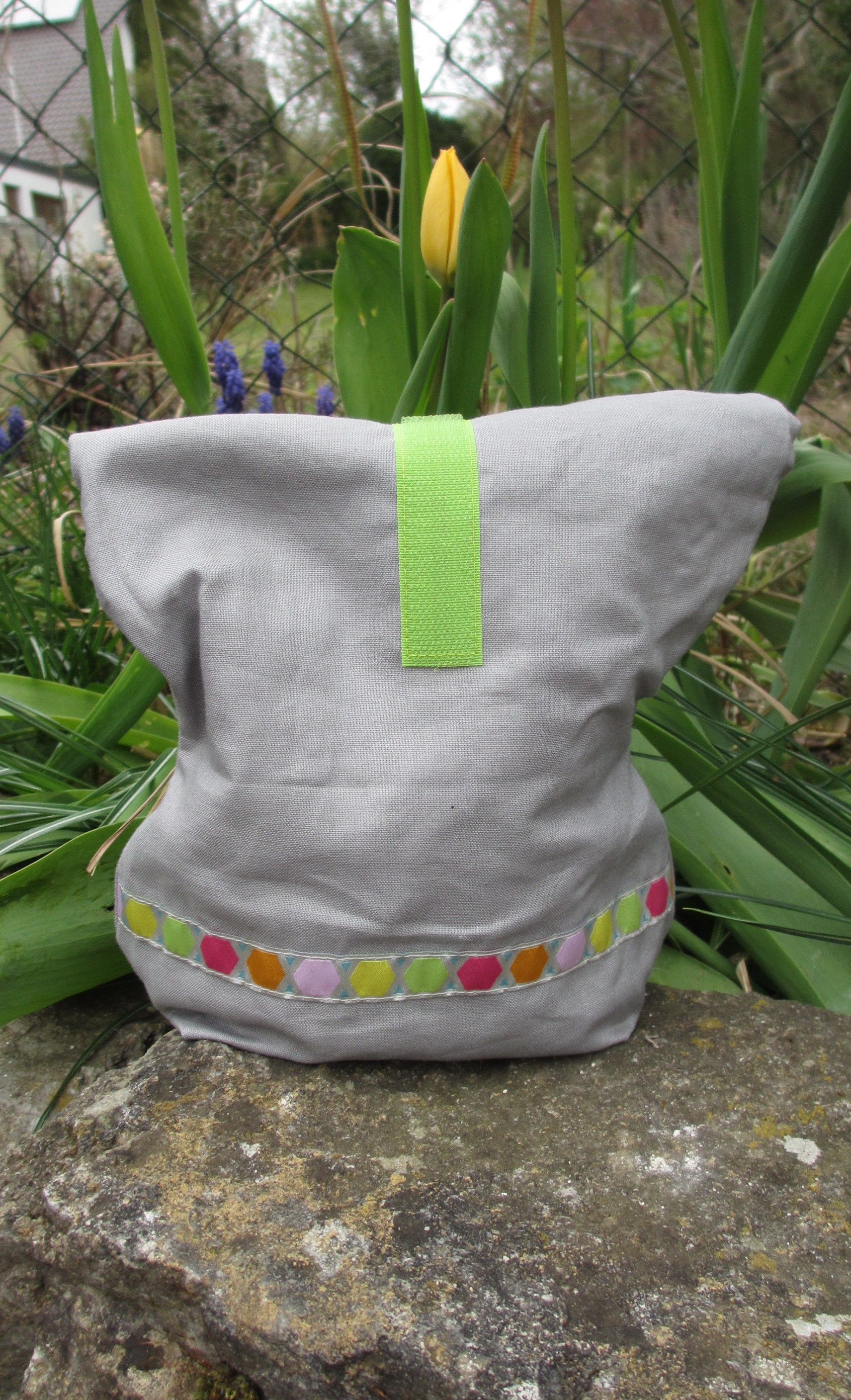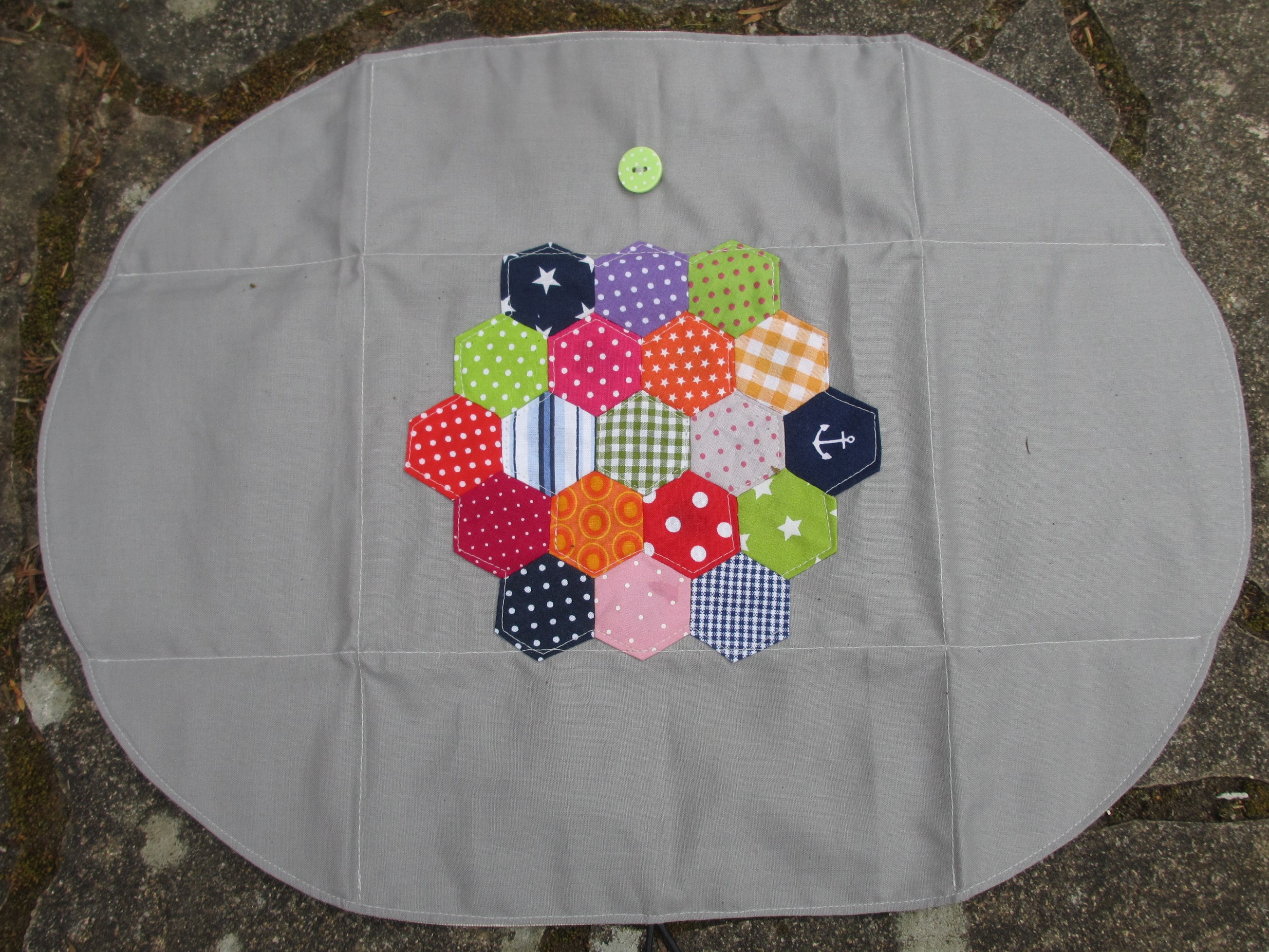 Es hat alles wunderbar geklappt. Benjamins Getränkeflasche hat Platz, die Box für verlorene Zähne kann in der aufgesetzten Tasche aufbewahrt werden. Innen ist alles mit einem gelben beschichteten Staaars ausgestattet, verlorenes Gemüse oder verschmierte Butter kann also leicht wieder entfernt werden. Vorne gibt es einen reflektierenden Hexie-Anhänger, der einen weiteren Kreis verdeckt, auf dem Benjamins Name steht (die Inspiration dazu kam mir beim Lesen von Pamelas Blog / Bonnbon, ihre Wichtelpartnerin hat einen wunderschönen Hexie-Anhänger gestaltet). Auch an der Seite und auf der Klappe habe ich mit Reflektorstoff gearbeitet, bei der Klappe der aufgesetzten Tasche habe ich eine reflektierende Paspel eingesetzt. In der Dunkelheit kann er jetzt nicht mehr übersehen werden. Der mit Klett verschließbare Brustgurt kann komplett entfernt werden, wenn er nicht mehr benötigt wird.