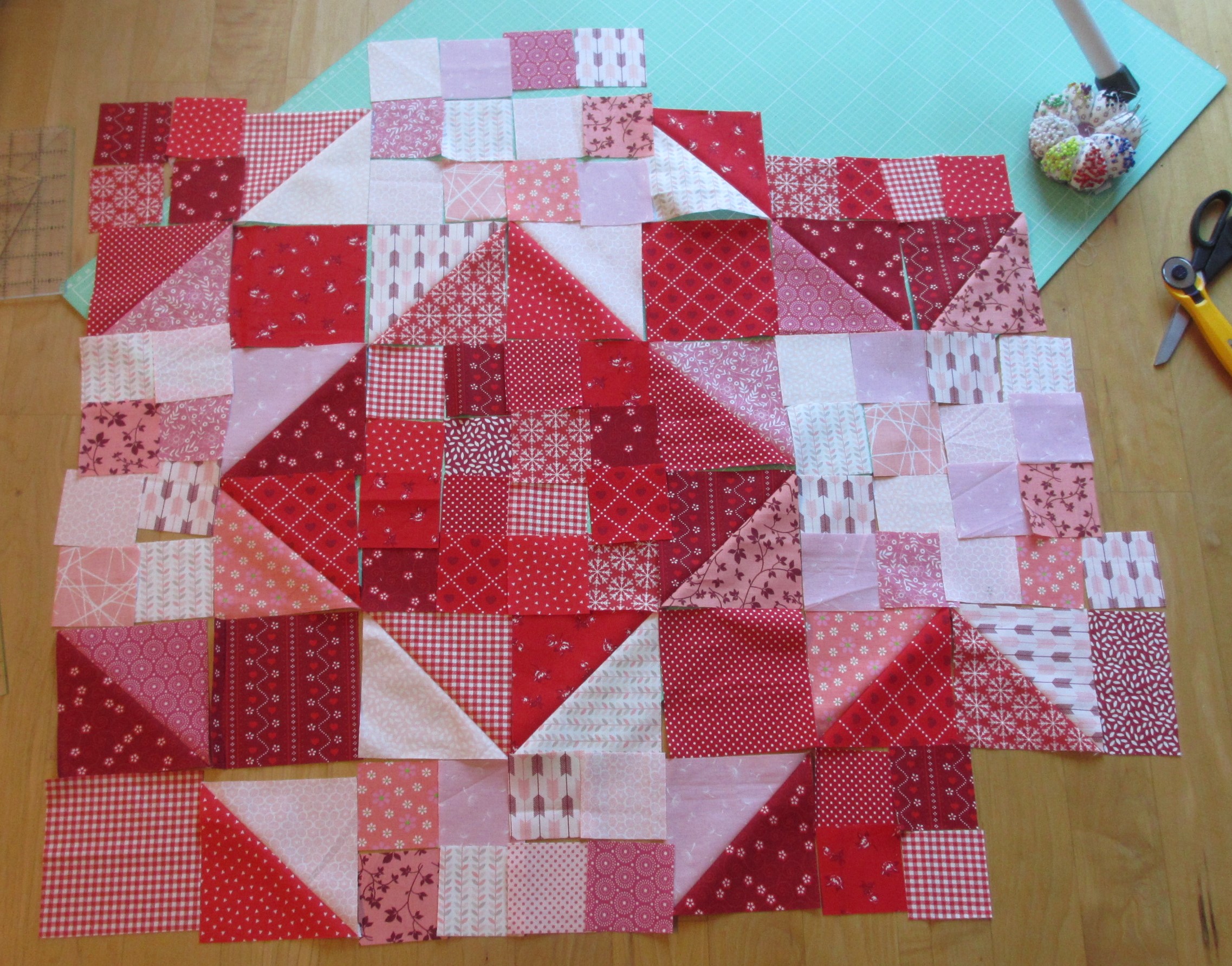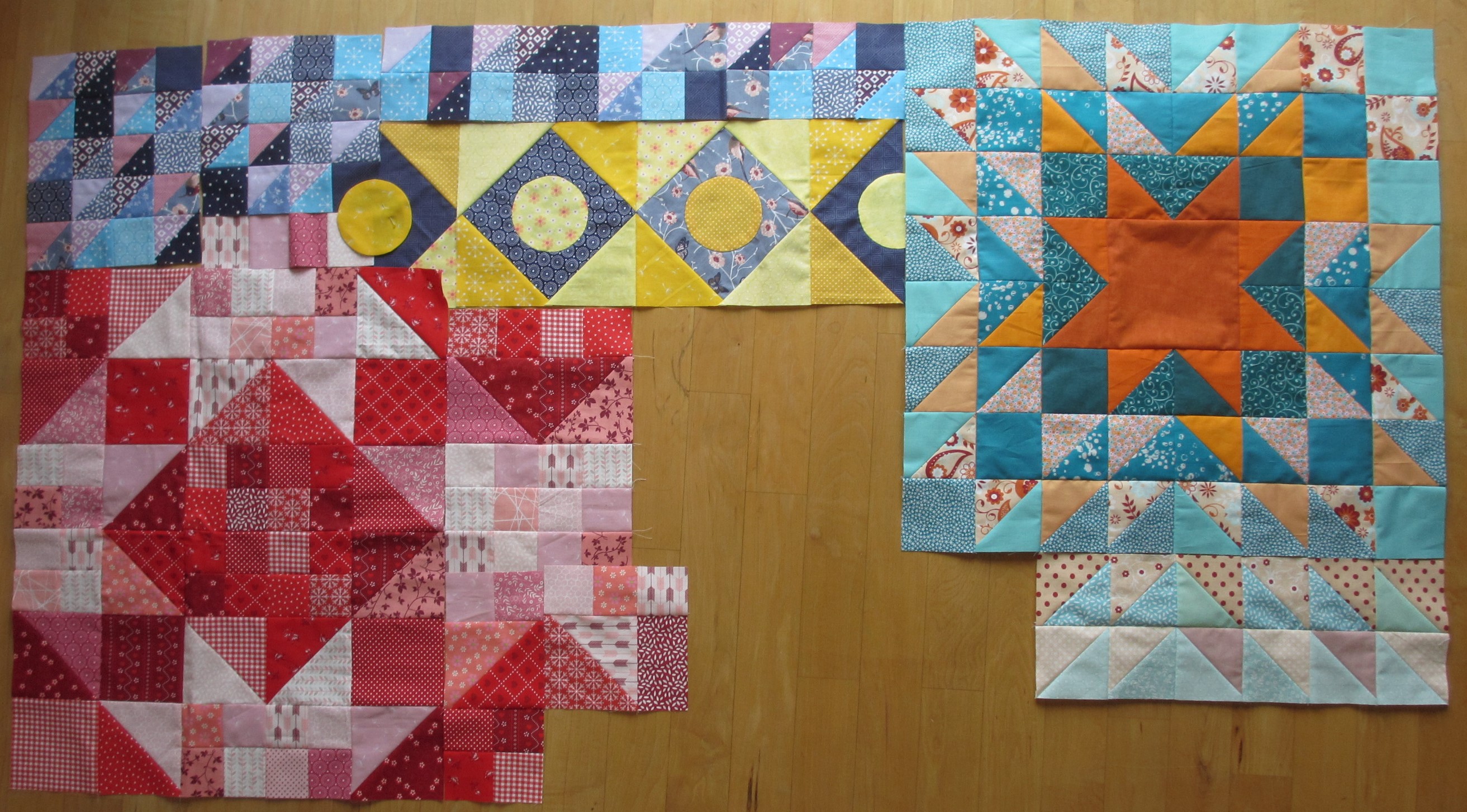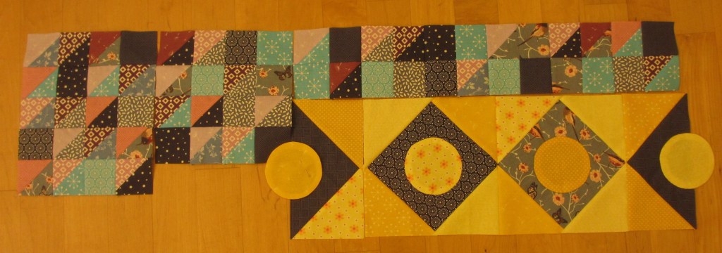 Hier muss ich gestehen, dass der Checkers-Block rechts unten noch gar nicht genäht wurde. Allerdings kann man da ja nicht so viel falsch machen, wenn man schon die Maße hat, ich hoffe einfach, dass sich das irgendwie hinzufügen lässt!
