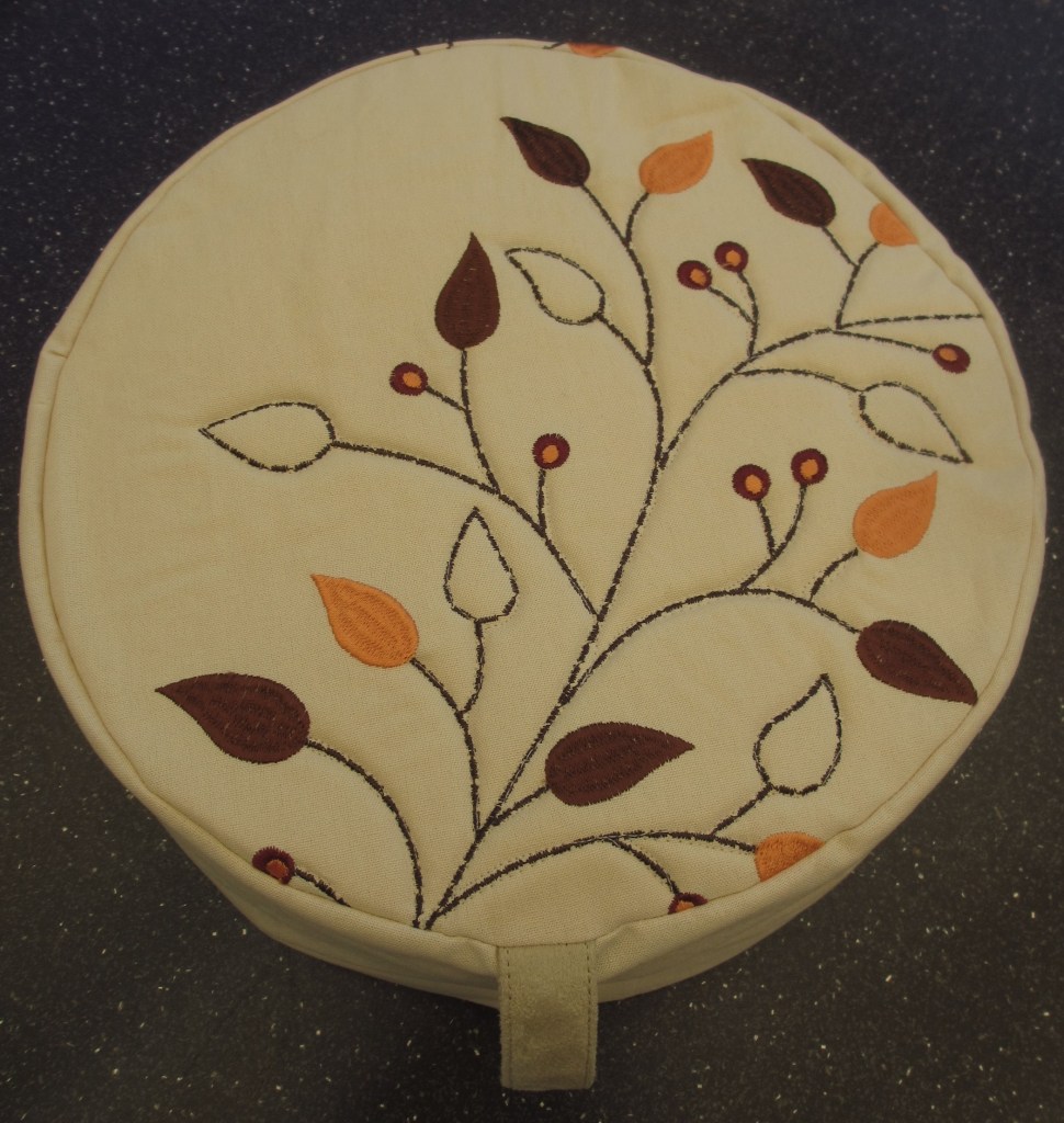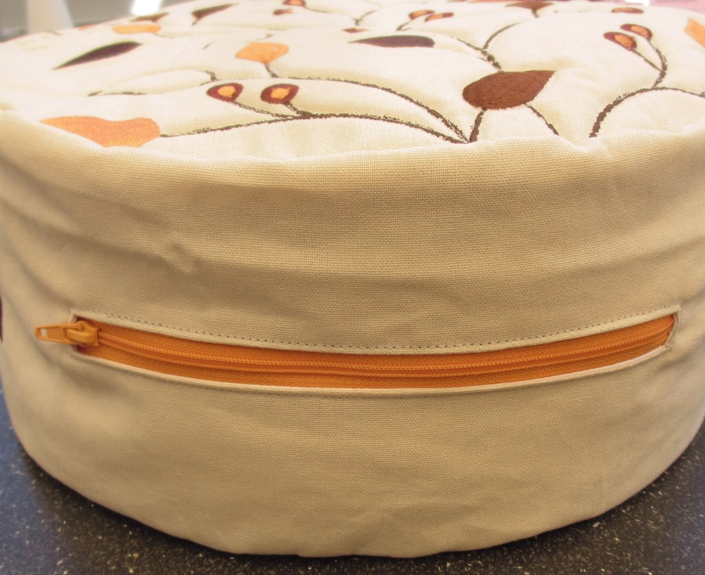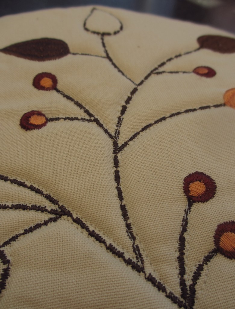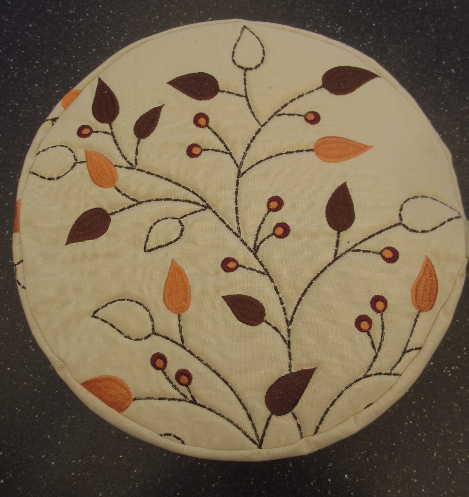 Und die letzte Variante mit Reißverschluss und Freihandquilting auf Ober- und Unterseite ist aus einem nicht benutzten Tischläufer entstanden. Da habe ich die schönsten Stücke ausgeschnitten und einfach die Blätter, bzw. Stängel nachgenäht. Von einer alten Tasche wurde ein Ledergurtband eingenäht, das wunderbar dazu passt.