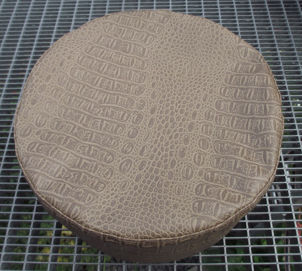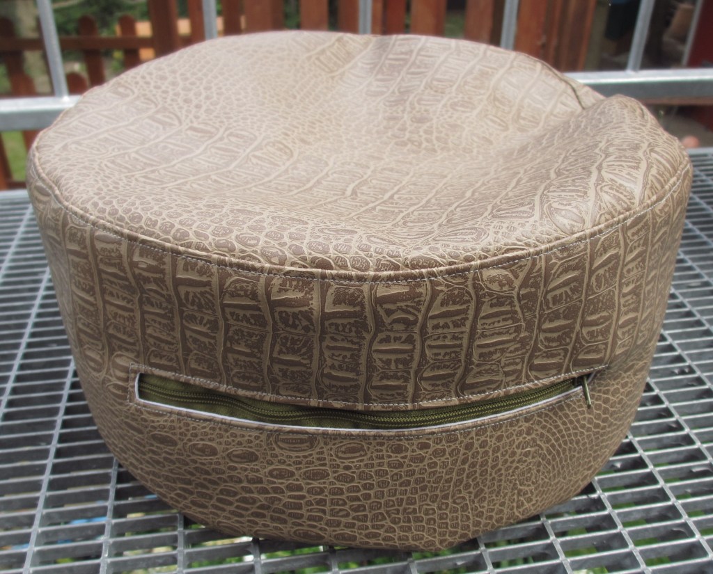 Beim dritten Kissen habe ich das Stylevil mit einem Herz an die Oberseite geheftet. Und dann habe ich experimentiert. Zuerst mit dem Dekostoff, der vom Fasching übrig geblieben ist. Diese beiden Kuh-Kissen haben aber die Kinder beschlagnahmt. Da befindet sich der Klettverschluss auf der unteren Seite, sie können gut befüllt werden. Eine weitere Version aus Kunstleder hat weder Absteppung auf der Oberseite noch Tragegriff, dafür aber einen Reißverschluss an der Seite. Sieht sehr edel aus.