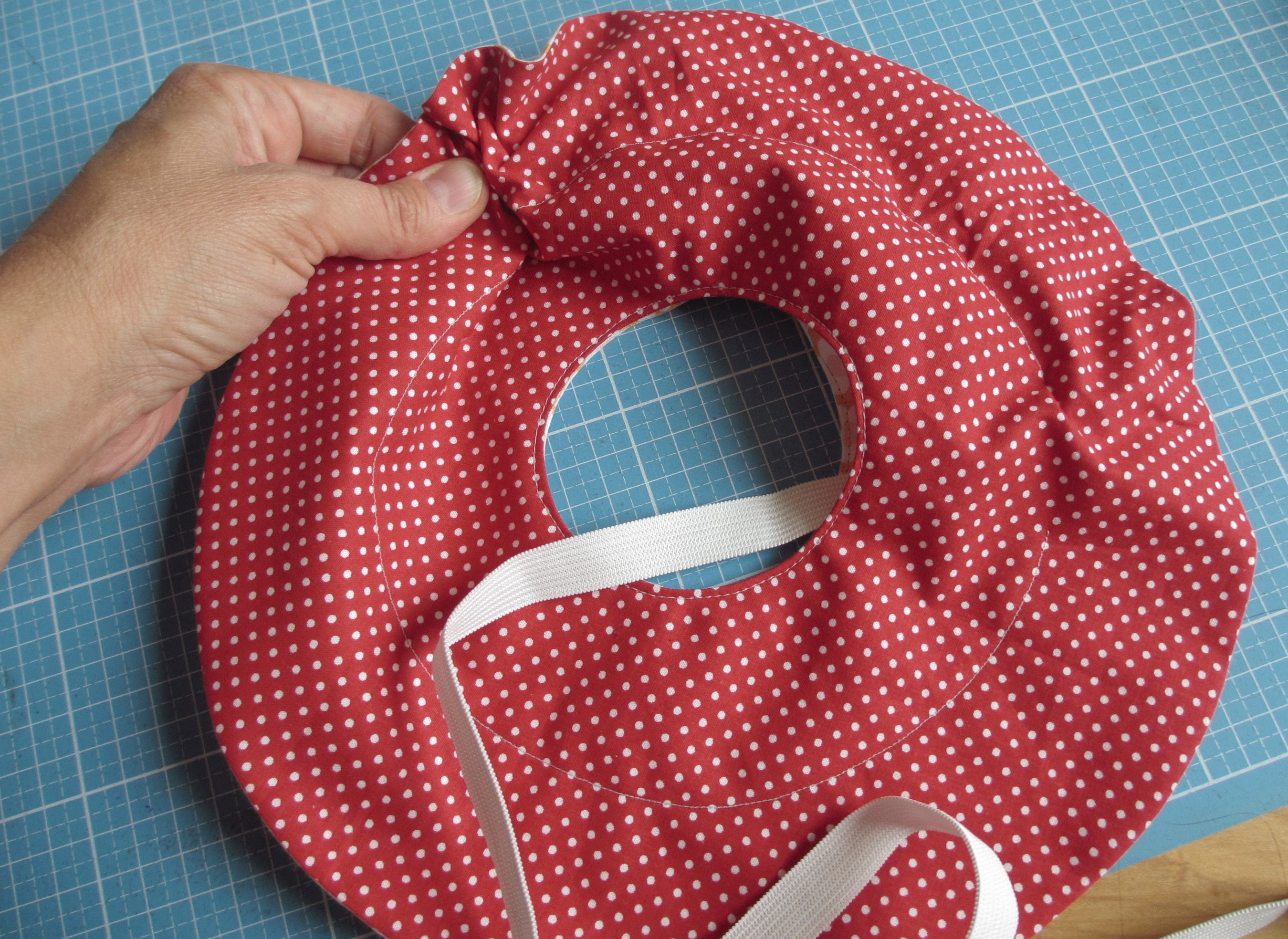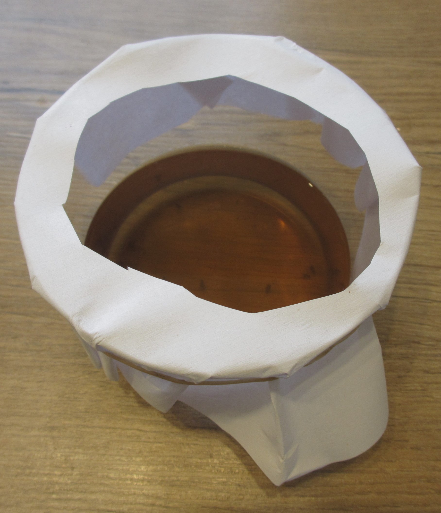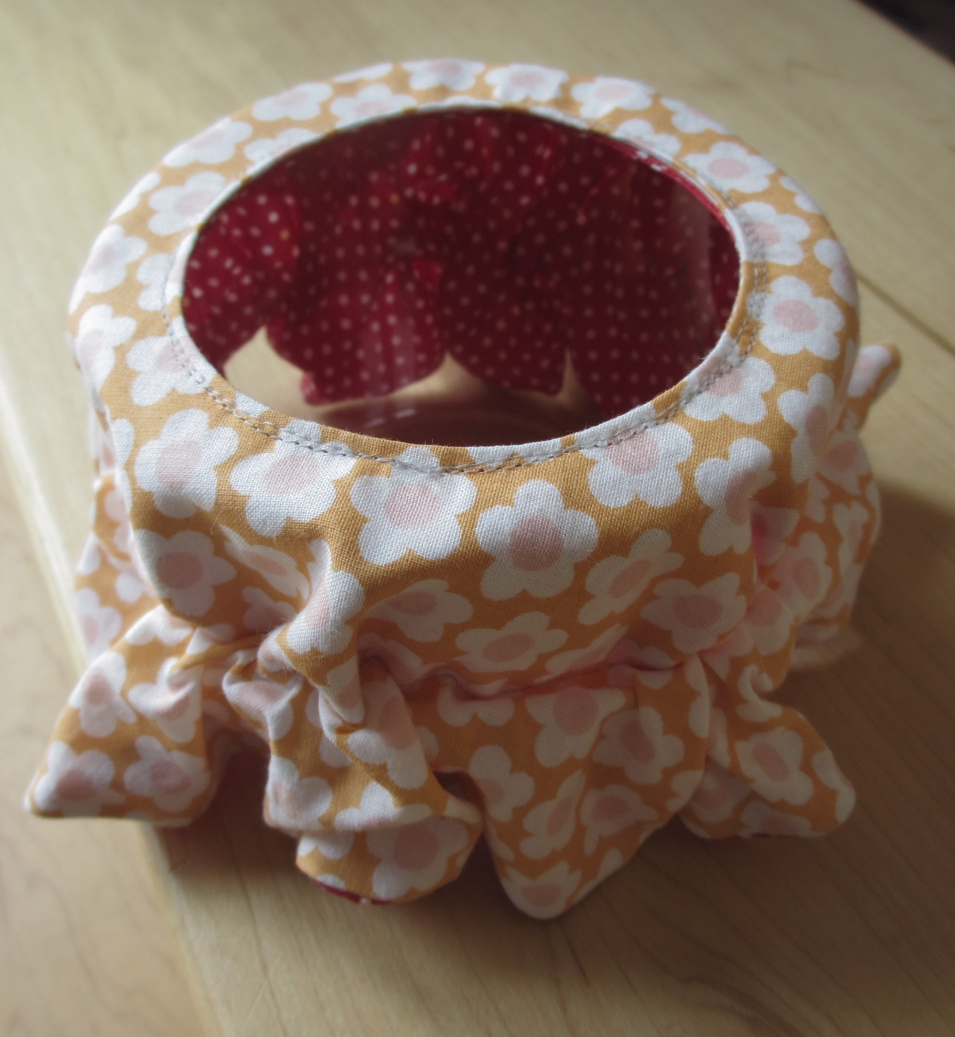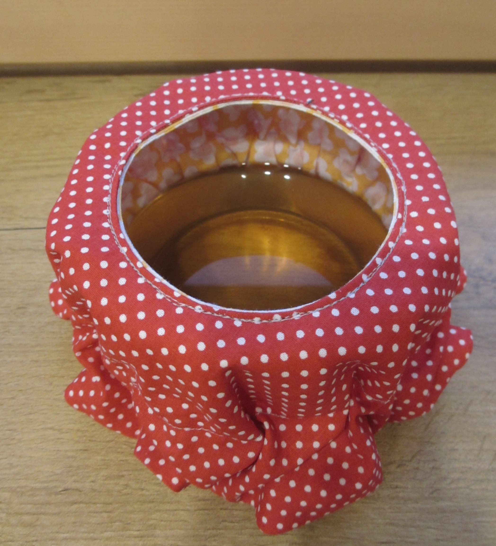 Die Fruchtfliegen in der Küche haben wir mit der altbewährten Mischung aus Essig, Saft- und Bierresten, warmem Wasser und einem Spritzer Seife sehr gut in den Griff bekommen. Die Abdeckung für die Fruchtfliegenfalle musste bis jetzt jedes Mal aus Papier hergestellt und mühsam mit einem Gummi am Gefäß befestigt werden. Geht zwar schnell, sieht aber unschön aus – deshalb habe ich heute eine „nachhaltige Abdeckung“ dafür genäht, die sogar gewendet werden kann. Durch den eingezogenen Gummi hält das Teil auf drei unterschiedlich großen Gefäßen.