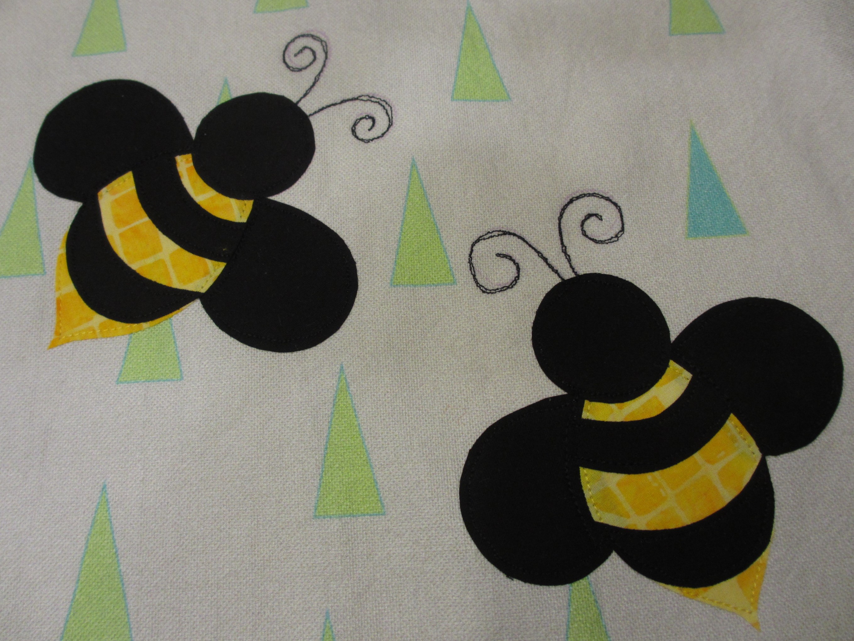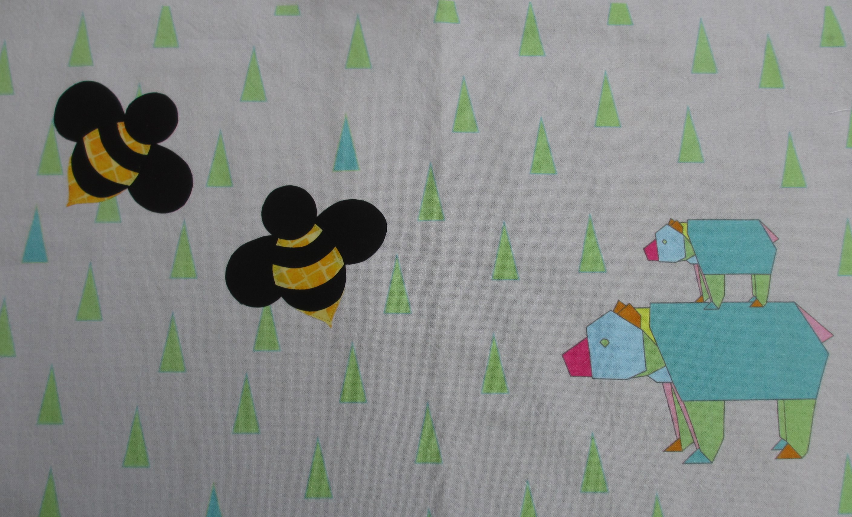 In diesem herbstlichen Monat schaffe ich es gerade mal einen halbfertigen Zustand zu präsentieren. Die letzte Tasche aus dem Farbenmix-Viererpack wurde endlich begonnen. Was ich dort applizieren wollte, wusste ich schon im Februar. Die Bienen passen doch gut zu den Bären, auch wenn ich sie am Ende nicht eckig, sondern rund gemacht habe.