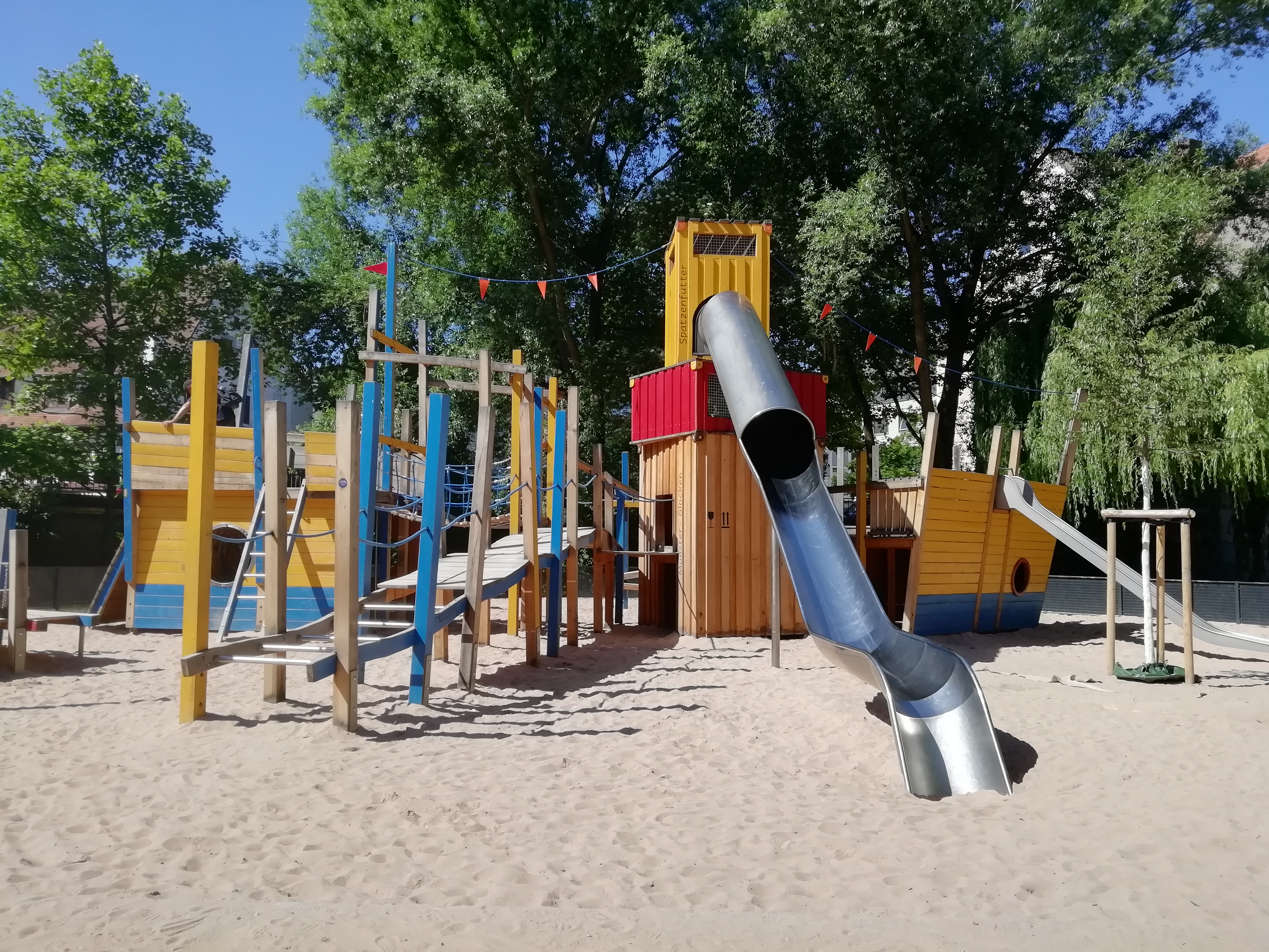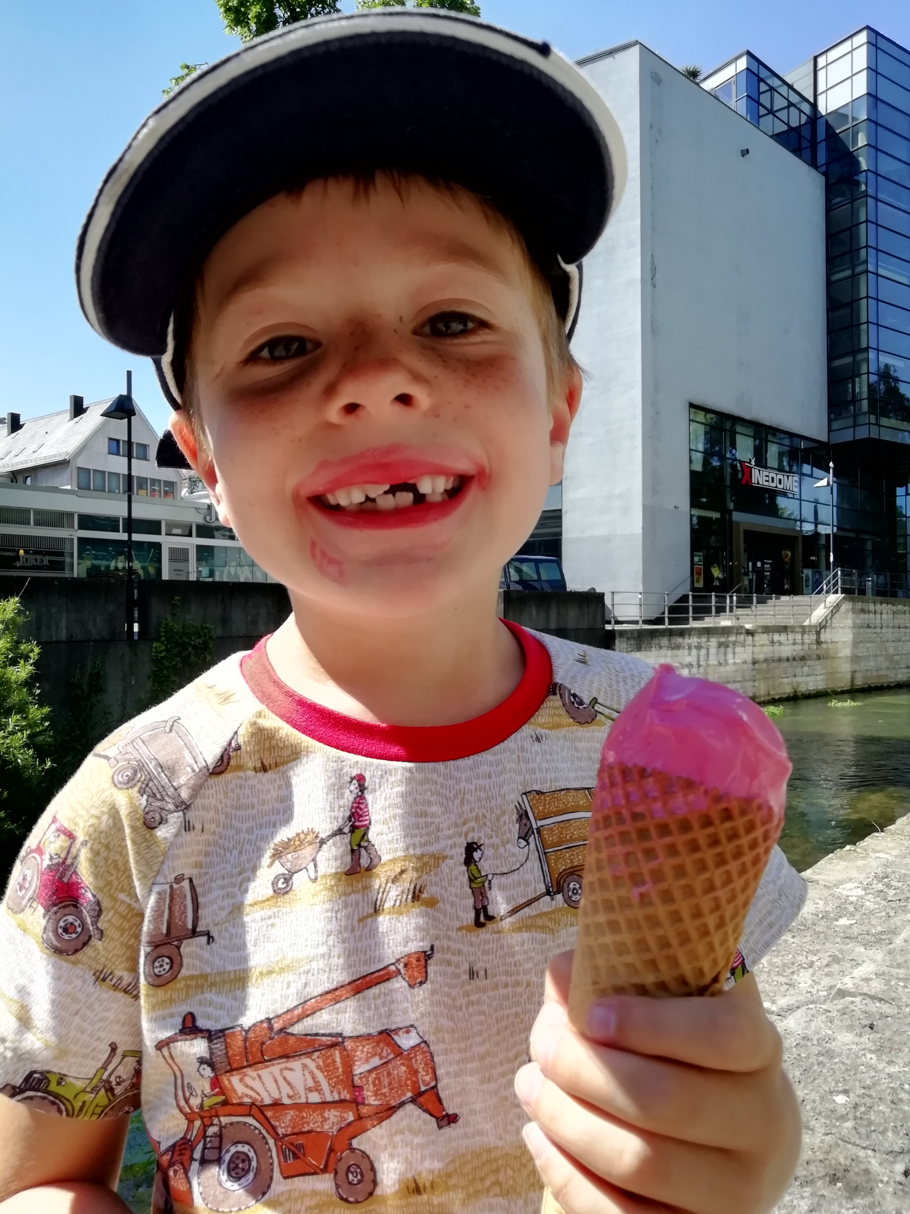 Das hat alles ganz toll geklappt. Es waren nicht viele Leute im Zug, und in der Fußgängerzone auch (noch) nicht, denn wir waren bereits um halb zehn dort. Wir sind also vorbei an unzähligen neuen Bauten Richtung Münster gelaufen (zu meiner Verteidigung muss ich gestehen, dass ich seit 2014 nicht mehr in dieser Gegend war). Im Müller habe ich den Kindern das Spielzeug-Stockwerk gezeigt – ein Fehler, wie sich bald herausstellte… Dann sind wir zur Blau abgebogen und auf einen tollen Spielplatz gegangen. Leider hatte Frederik heute einen „Ich-bin-dagegen-Tag“ und zuerst war ihm der Spielplatz zu voll, dann war alles zu klein und er hat sich überall den Kopf angeschlagen. Aber 45 Minuten haben sich die beiden dann doch amüsiert. Auf dem Rückweg zum Bahnhof haben wir ein Eis gekauft (Frederik war dagegen, weil es noch zu früh am Tag für ein Eis war) und gesehen, wie jemand in Handschellen abgeführt wurde.