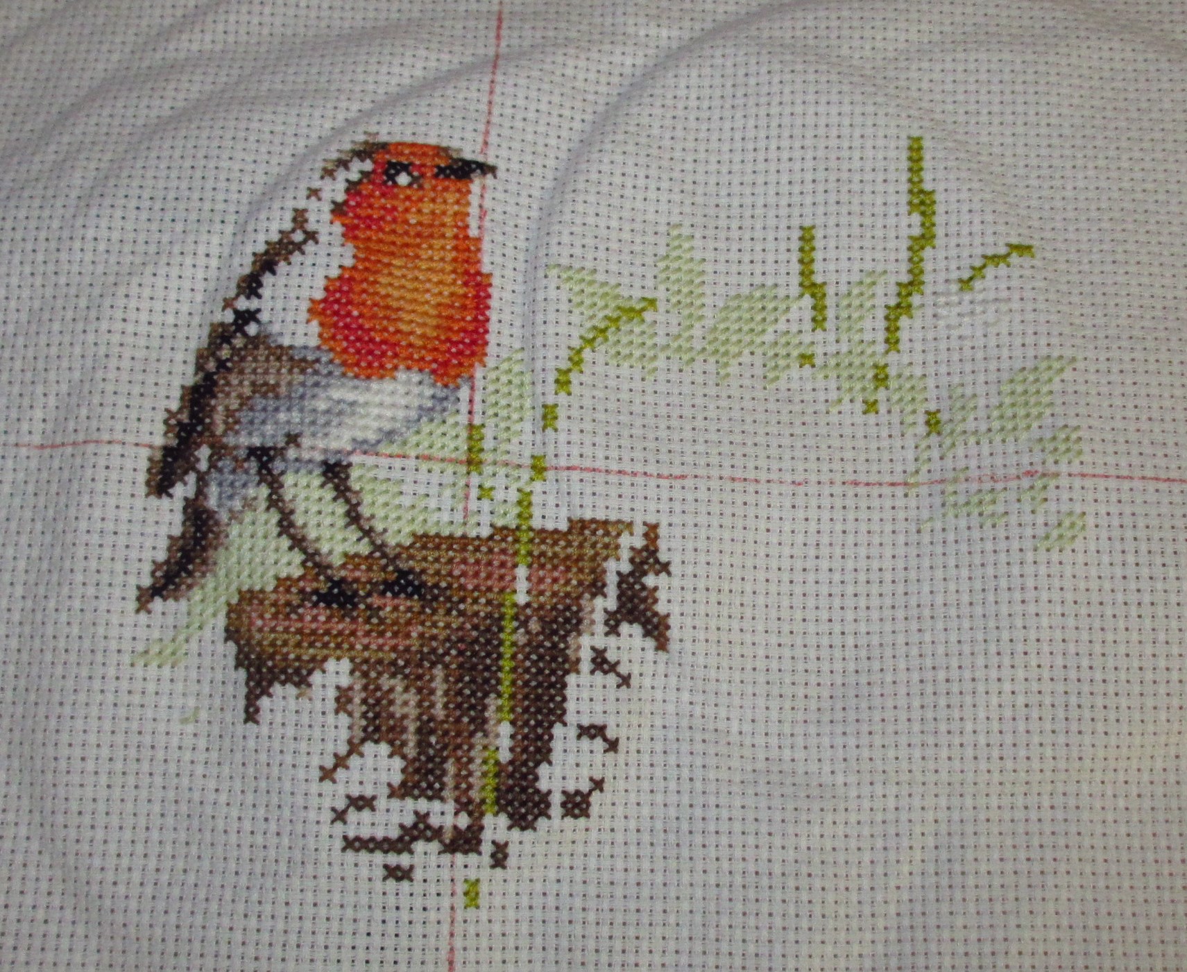 Der Februar scheint bei mir der Monat der Stickerei-Wiederentdeckung zu sein. Aber auch wenn das Rotkehlchen noch Monate drauf warten muss, inmitten einer Blumenwiese auf einem Baumstumpf zu stehen – ich bleibe dran!