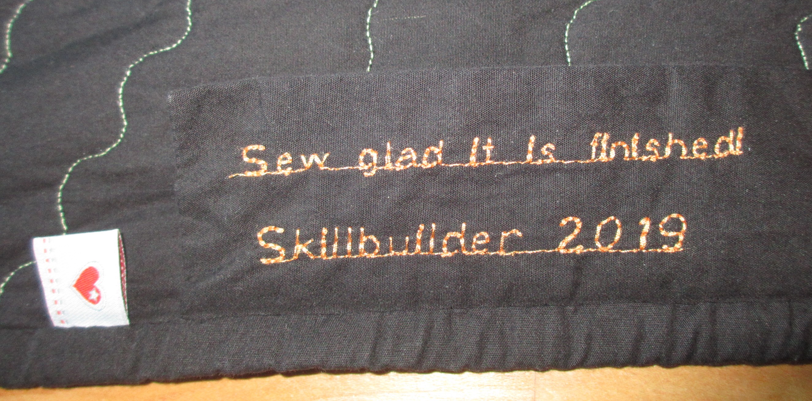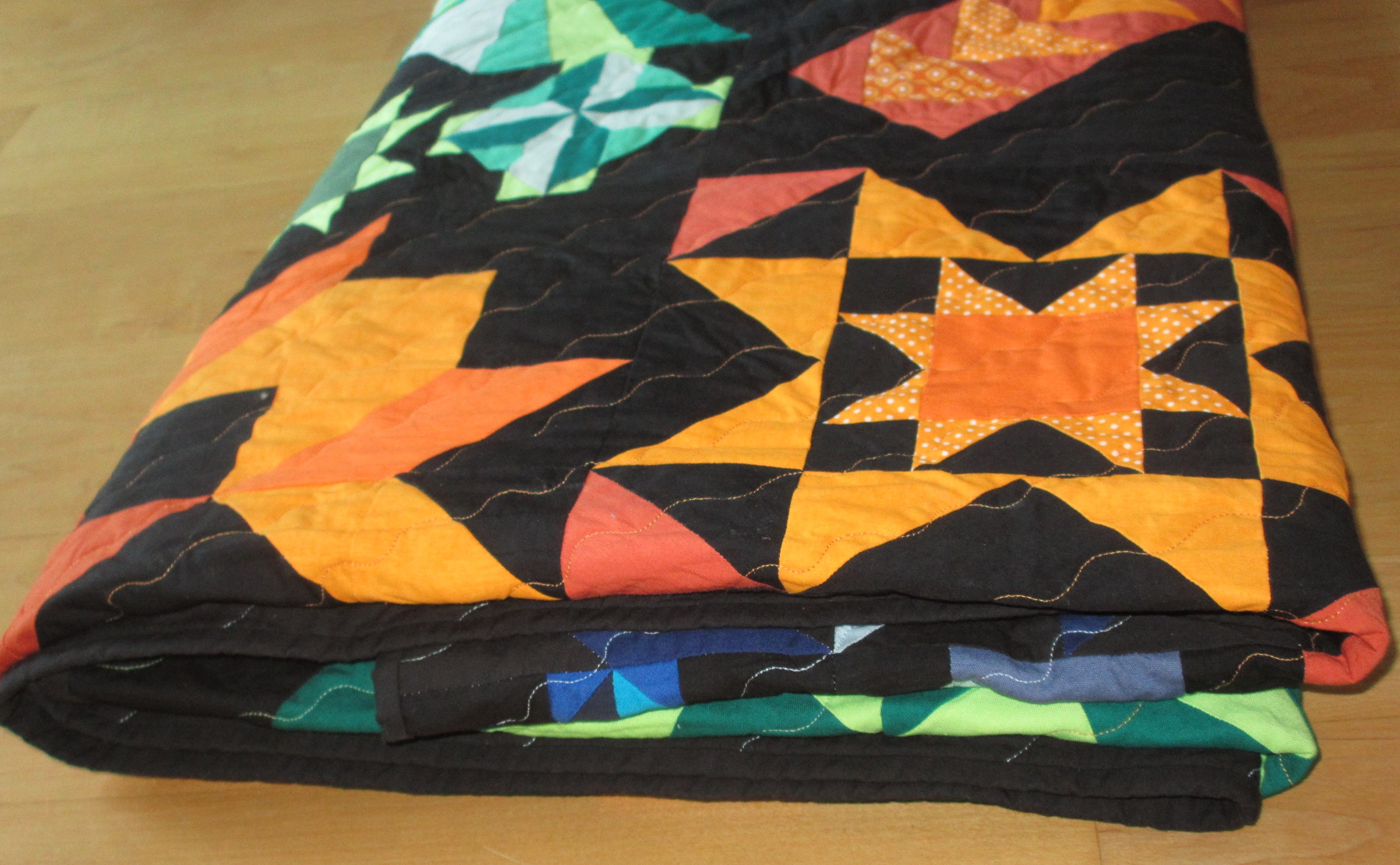 Begonnen wurde er bereits im Januar 2019 mit dem Merry Kite. Und im Dezember desselben Jahres war das Top fertig zusammengenäht. Mein Mann sollte den Quilt bekommen, das hat sich im Laufe des Jahres so herauskristallisiert. Für ihn war er aber in dieser Größe zu klein zum gemütlich darunterliegen. Also wurde das Projekt erst einmal in der Galerie über das Geländer gehängt und ignoriert. Dann kam der März 2020, der rückblickend wirklich niemandem gepasst hat und die nächsten 9 Monate waren geprägt von wenigen Zusammenkünften mit Freunden und Familie, Kindern, die zu Hause lernen mussten oder die nicht mehr in den Kindergarten gehen durften, weil die Mama leider nicht in einem systemrelevanten Beruf gearbeitet hat. In der Zeit habe ich ziemlich wenig am Skillbuilder weiter gemacht. Nur oben und unten mit schwarz verlängert. Hin und wieder angeschaut und mich gefragt, ob das jemals was wird. Im August 2021, die Kinder waren fast drei Tage mit Oma und Opa im Urlaub, wurde er gequiltet und das Binding auf der Vorderseite angebracht – nur, um ihn dann wieder auf dem Geländer zu parken. Mit jedem Mal Pause wurde es schwieriger, wieder zu beginnen. Nicht hilfreich waren zwischendurch auch Anmerkungen wie: „Warum hast du jetzt da oben und unten nicht noch weitere Blöcke dran genäht? – So sieht es ja komisch aus.“ und „Ich bin bestimmt schneller mit dem Ausbau von Frederiks Zimmer fertig, als du mit meinem Quilt.“